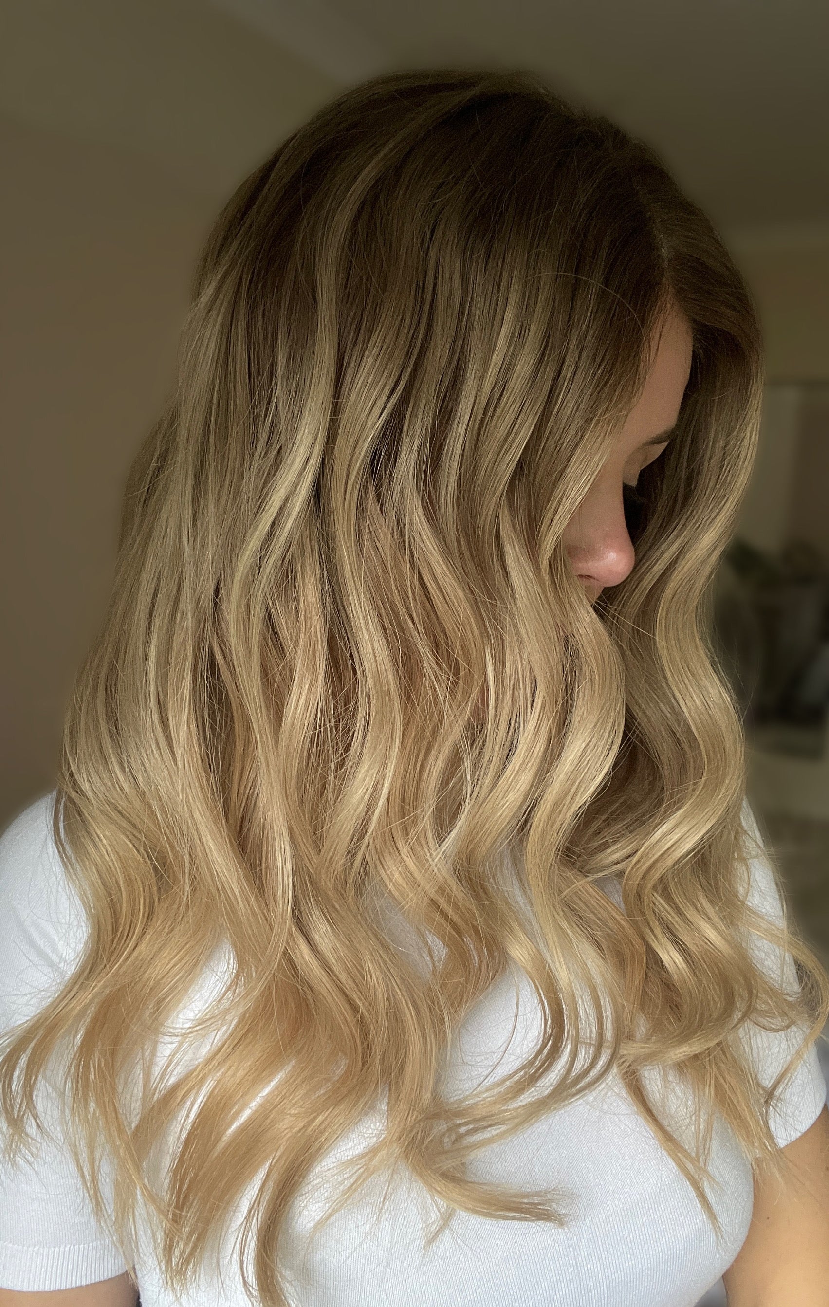 Hair colour - Dark blonde/light brown ombre light blonde with subtle face framing highlights